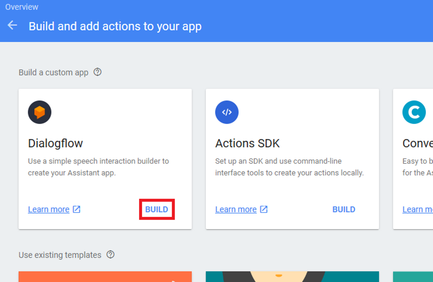 作成したプロジェクトをクリックし、ADD ACTIONSから Dialogflow のBUILDを選択します。