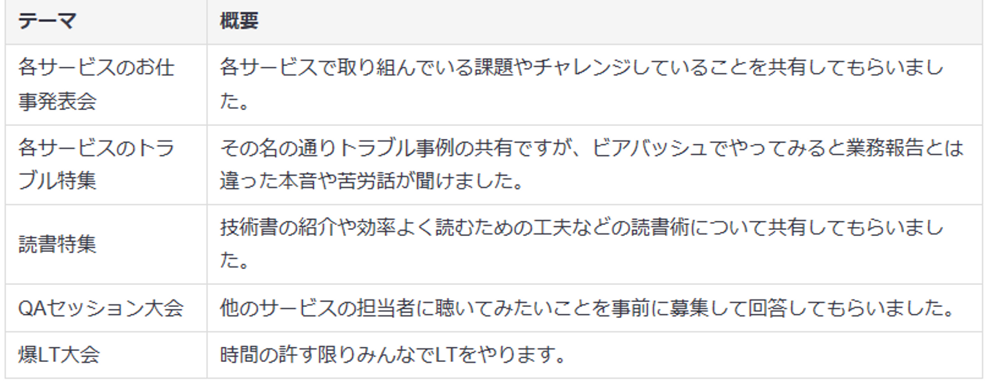ビアバッシュでは毎月テーマを決めて発表者を募集しています。同じ開発部のメンバー同士とはいえチームによって文化が違ったり、使っている技術が違っていたりするため、ある程度テーマを絞ったほうが発表者が発表しやすく参加者も参加しやすいだろうと考えて運営側でテーマを決めています。ただし、あくまで参加しやすい場を作る事が目的なので、多少テーマから外れた発表であっても指摘することはありません。