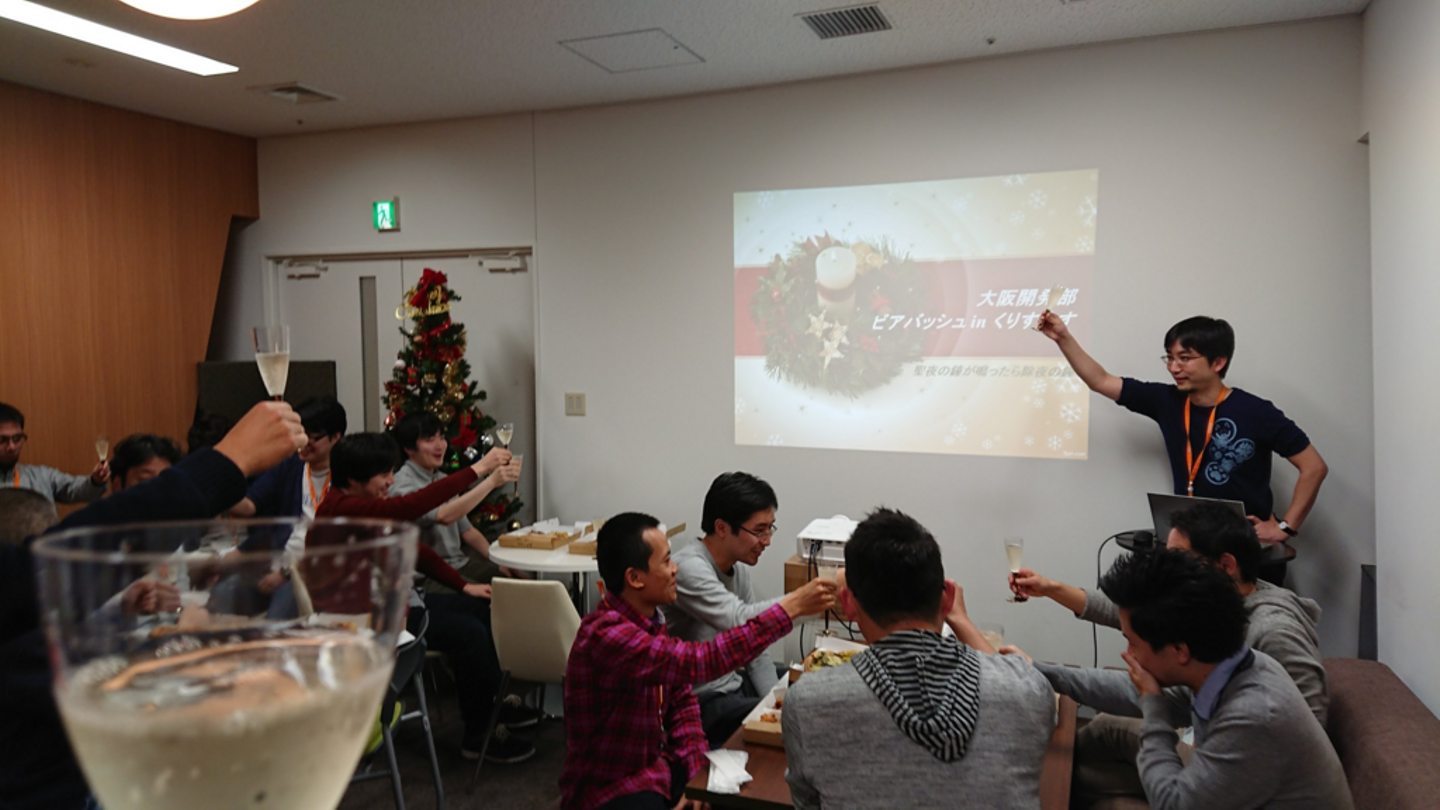 大阪の開発部で毎月実施している勉強会です。参加自由ですが会社予算で飲み物と軽食を出してもらっています。私は主にこの運営に関わっています。先日はクリスマス版で実施しました。