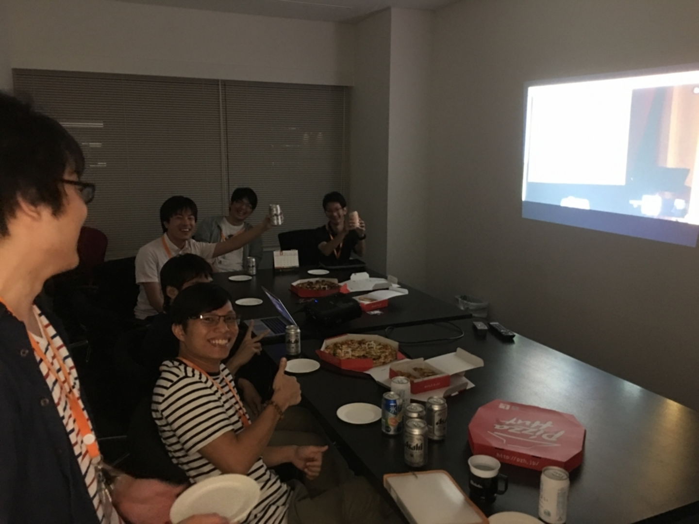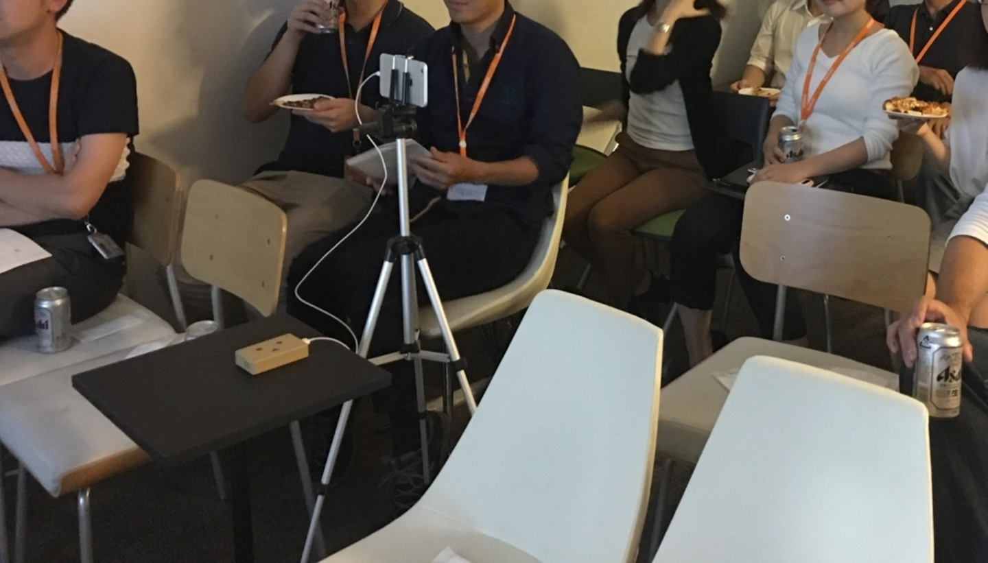 前出の開発部外からも参加者を招いてビアバッシュを実施したところ、人数が集まり過ぎてしまい会場に入り切らないという問題が発生しました。その対策として社内の会議室をサテライト会場にしてGoogleハングアウトを使って同時放映する方式を試してみました。しかし、映像が途切れたり中継の声が聞き取れなくて隣の本会場から笑い声だけが直接聞こえてくるなど、残念ながらこの試みは不評でした。
