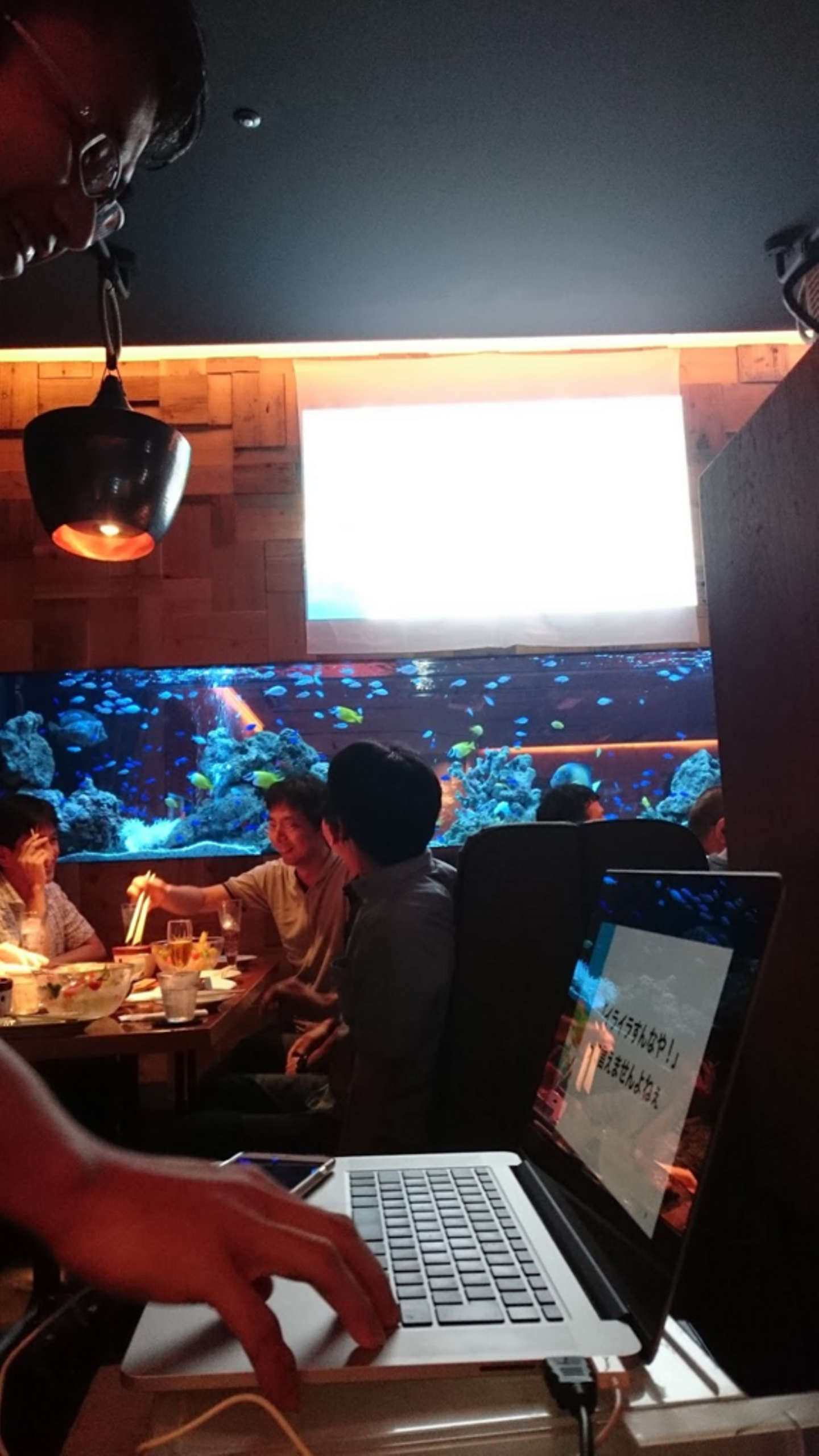 また、昨年は結婚式の二次会などで使う水槽のあるオシャレなお店を借りて、前出のハッカソンイベントの発表会を実施しました。
