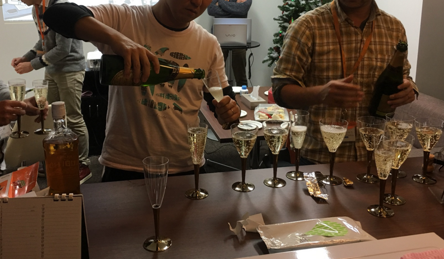 12月の回ではビールの代わりにスパークリングワインを出してクリスマスを演出してみました。過去に社内で営業目標の達成イベントが行われた時に使ったシャンパングラスを発掘してきて活用しました。