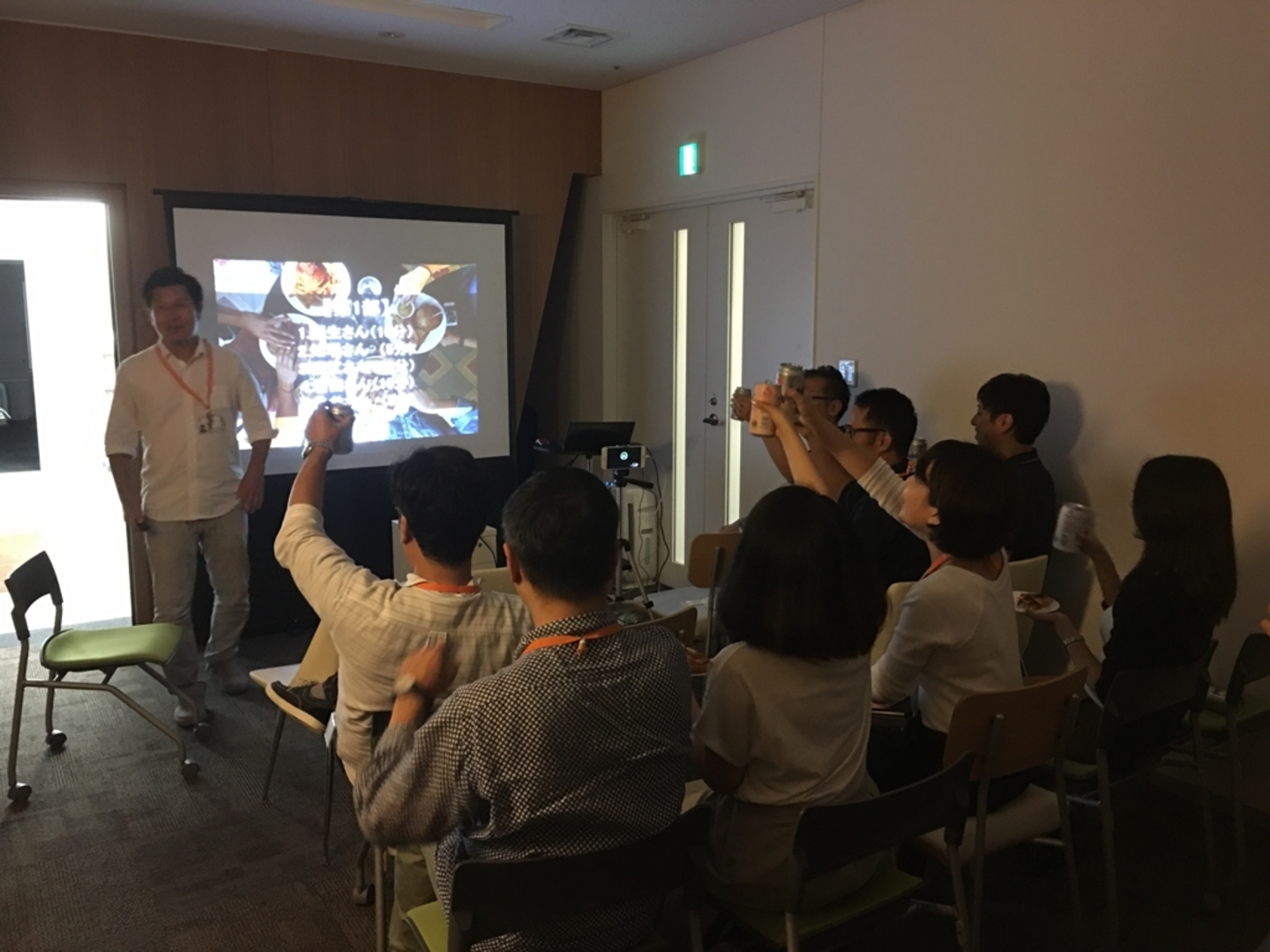 開発部では四半期に一度、部全体で懇親会を実施しています。その機会を利用させてもらい、懇親会の会場でビアバッシュを行いました。今年の7月にはカフェラボというグランフロント大阪内の施設を借りて実施しました。
