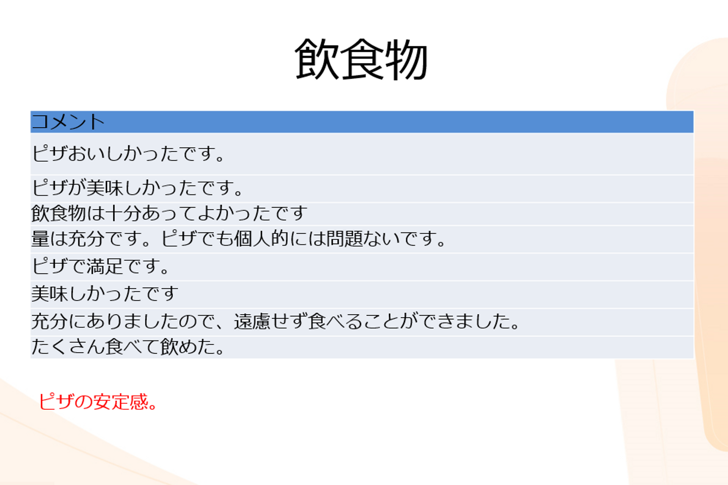 以上のように食べ物・飲み物も色々チャレンジしてみましたが、アンケートを取ってみたところ何だかんだピザの評判が良くて結局のところピザで充分という結論になっています。