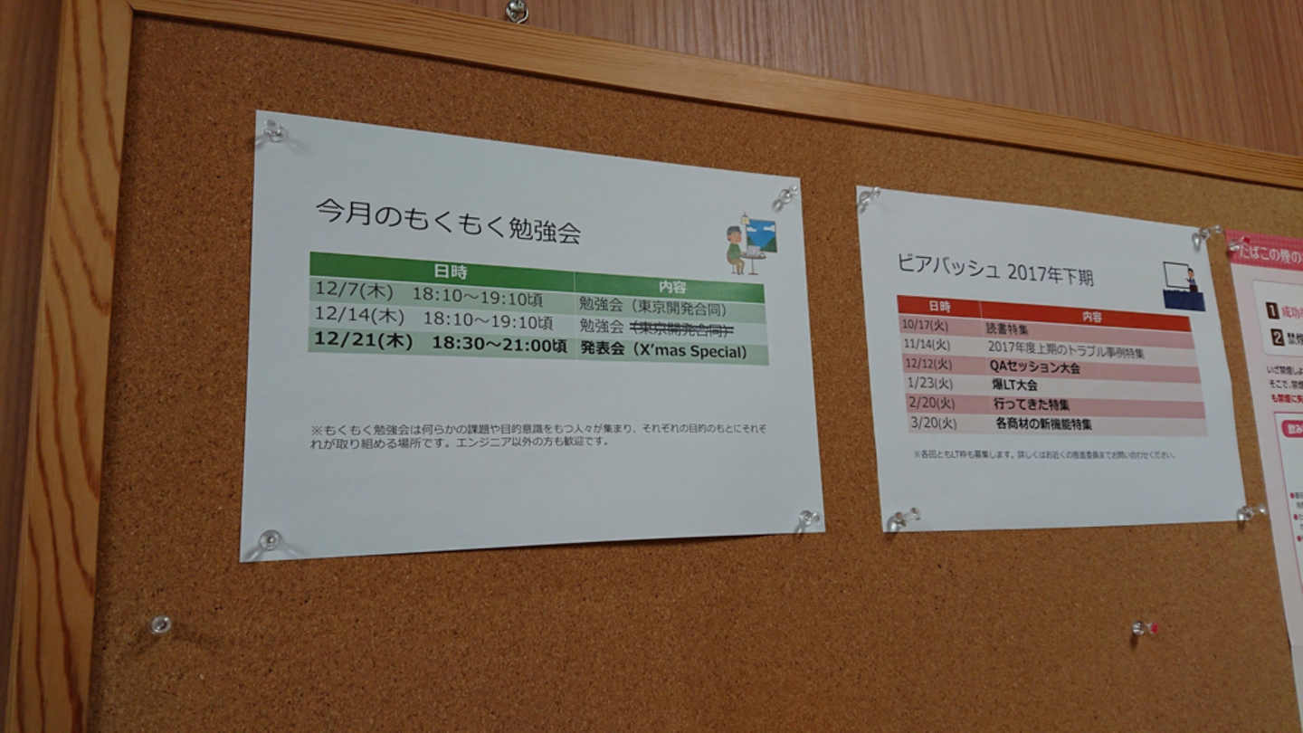 ビアバッシュは開発部内のイベントとして実施するため事前に出欠をとりますが、もくもく勉強会・発表会はその日参加できる人だけでゆるく実施しているので事前に出欠はとっていません。自由でゆるくやれるメリットはありますが、参加したいと思っていてもイベント自体を忘れていて参加できなかったという事が起こります。そのためカフェスペースの掲示板に予定を貼り出したり、開催当日に立て看板を設置して周知するようにしました。アナログな手法ですが、以前よりもイベントの存在に気づいて社内で声をかけてもらったりするケースが増えており、意外と効果が出ているように感じています。