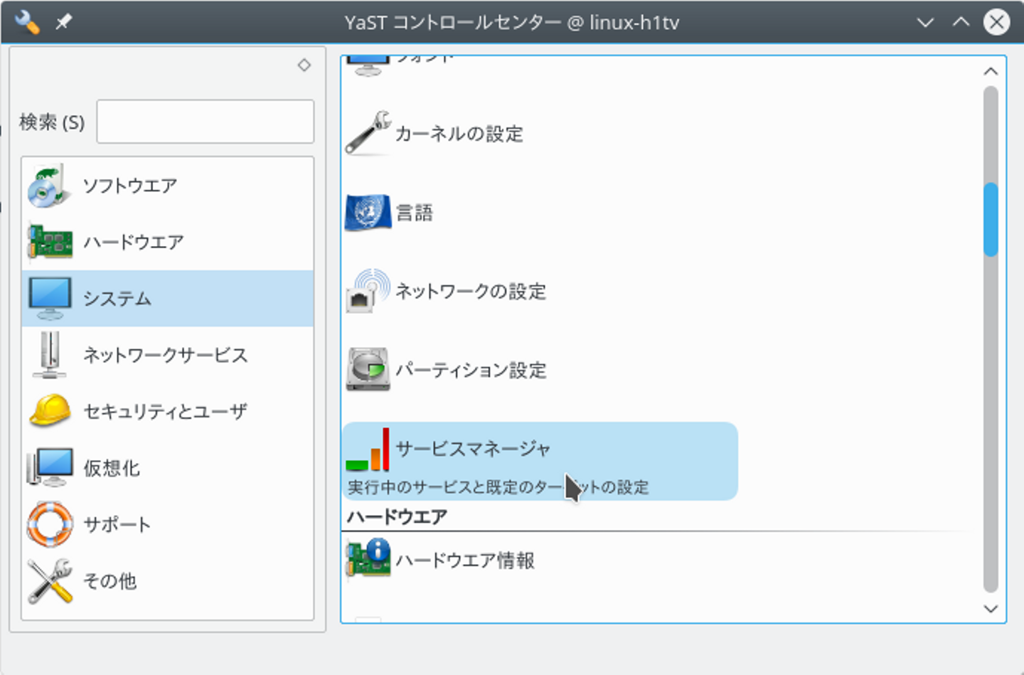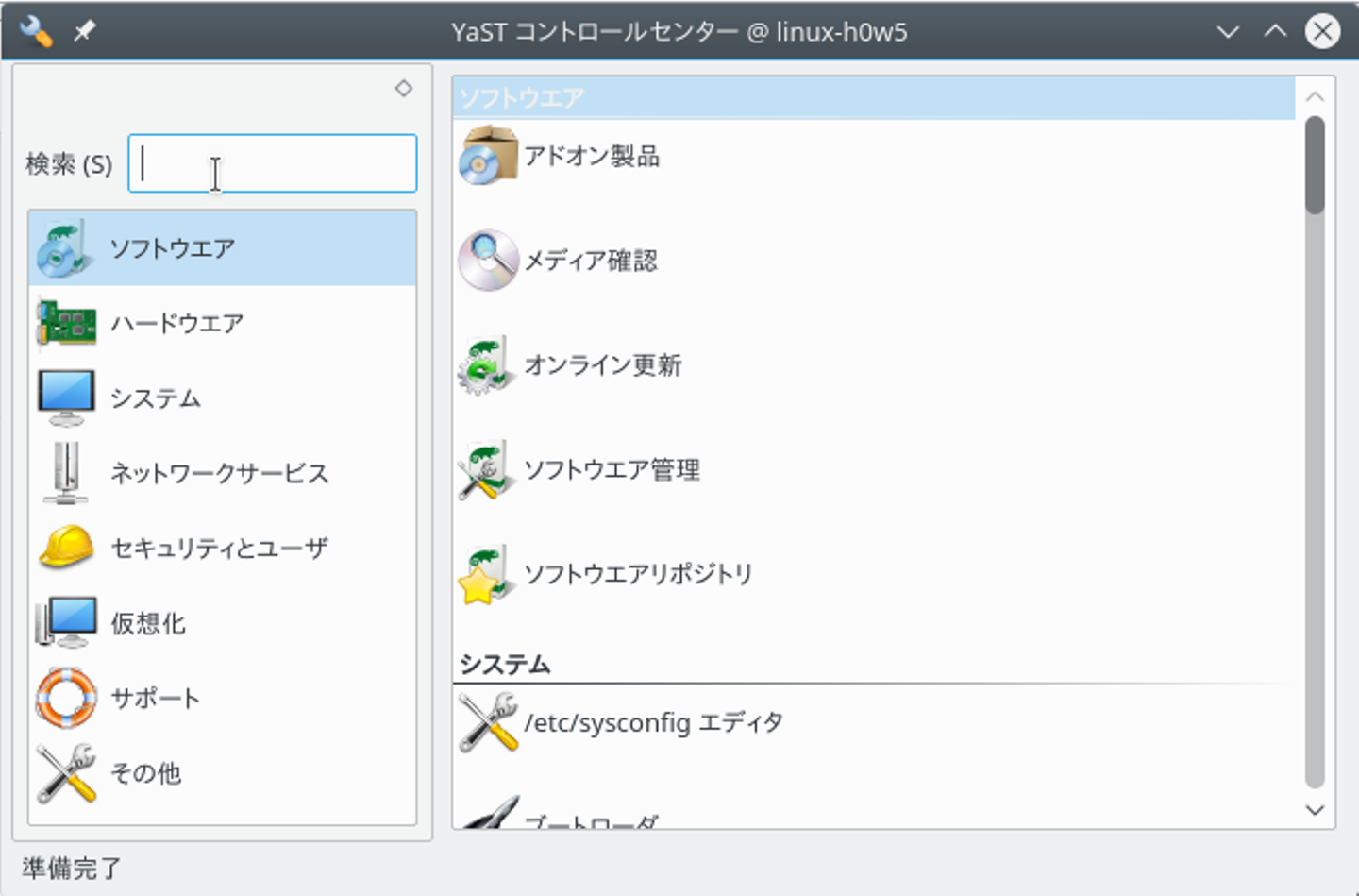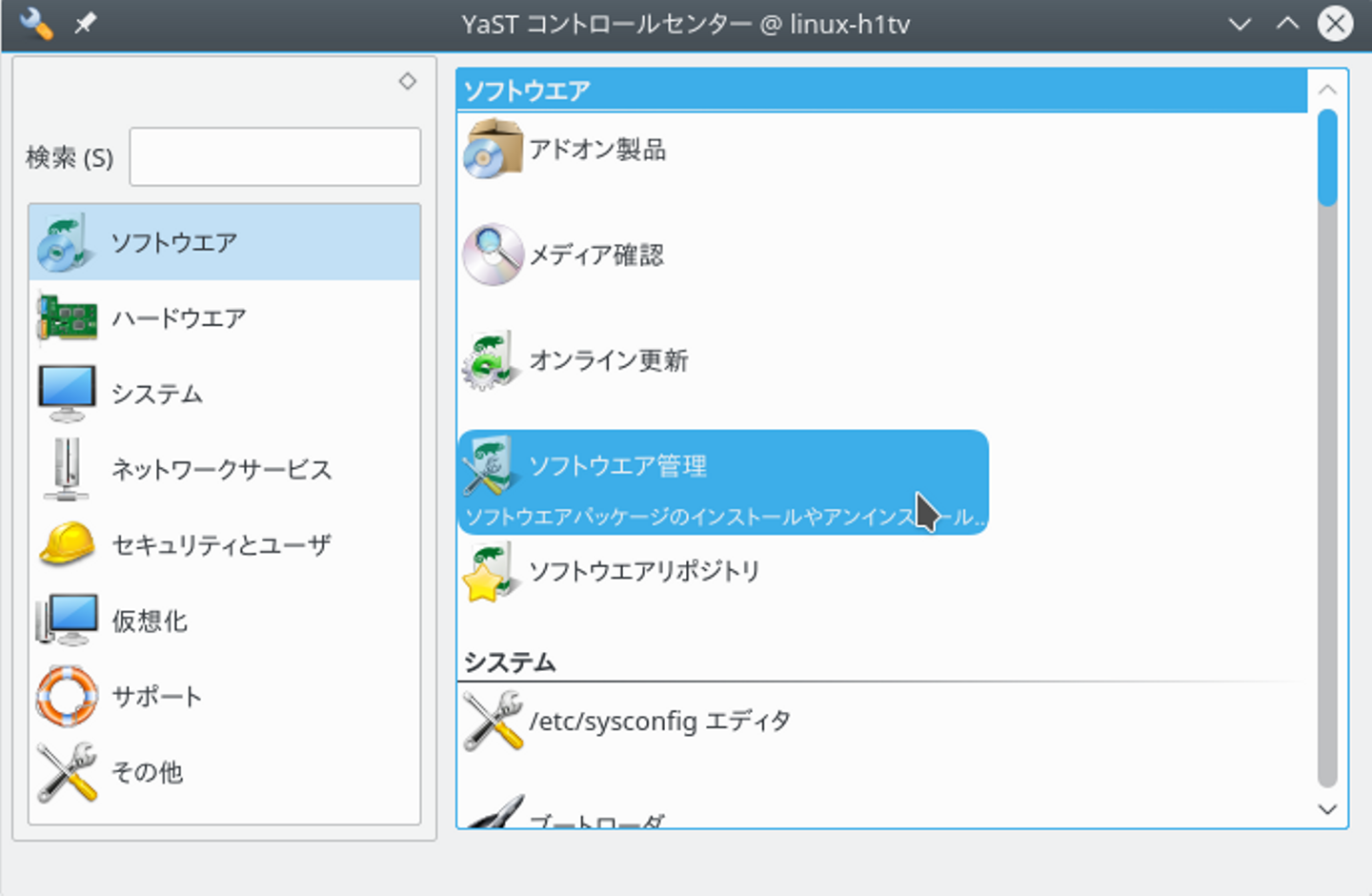 YaSTとは、 Yet another Setup Tool (もう 1 つのセットアップツール) の略で、システム全体の設定を行なうことができるように目指して作られています。