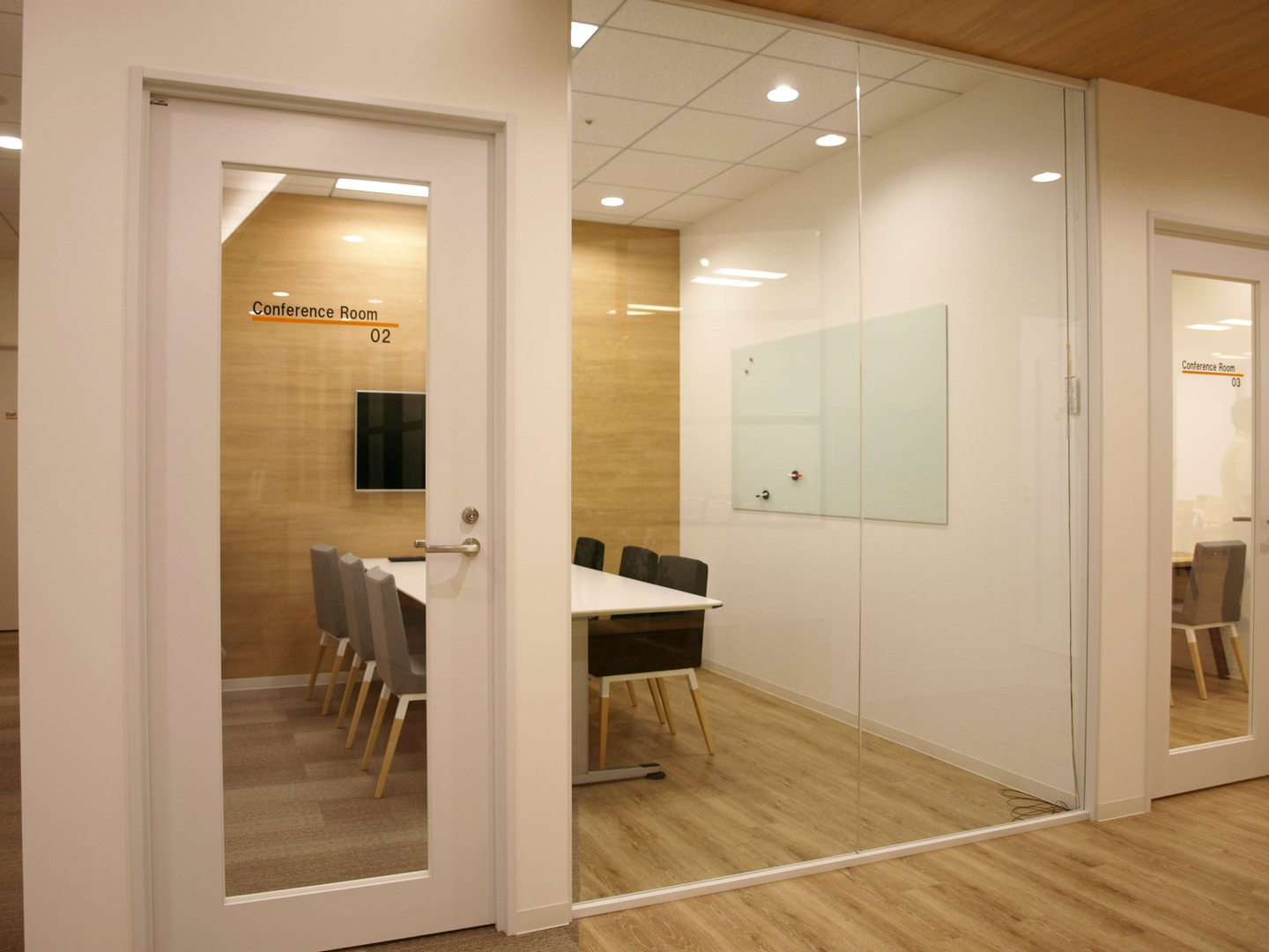 この会議室はエントランスの雰囲気を引き継いでウッディ。透明ガラスにすることで、ほかの人も打ち合わせの様子を感じ取ることができます。(仕掛け⑦)