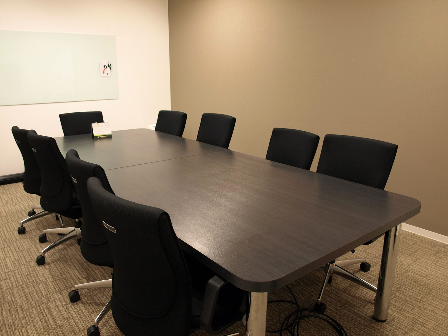 落ち着いたアースカラーの会議室。実際はもっと重厚感があります。椅子のクッションも厚め。