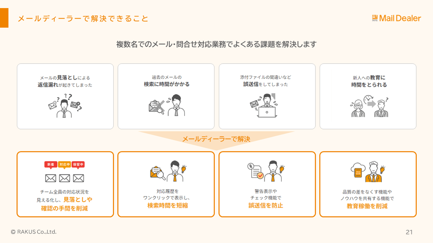 複数名で利用する共有アドレスやメーリングリストなどを管理する、便利なメールソフトだと思っていただくのが分かりやすいと思います。ネットショップの問い合わせ窓口など、複数名でメール対応していると、見落としや対応漏れが発生してトラブルになってしまったり、他の人が対応しているメールが見られなくて履歴が追えないといった課題があります。だれがどこまで対応しているかを可視化し、これらを解決するサービスです。