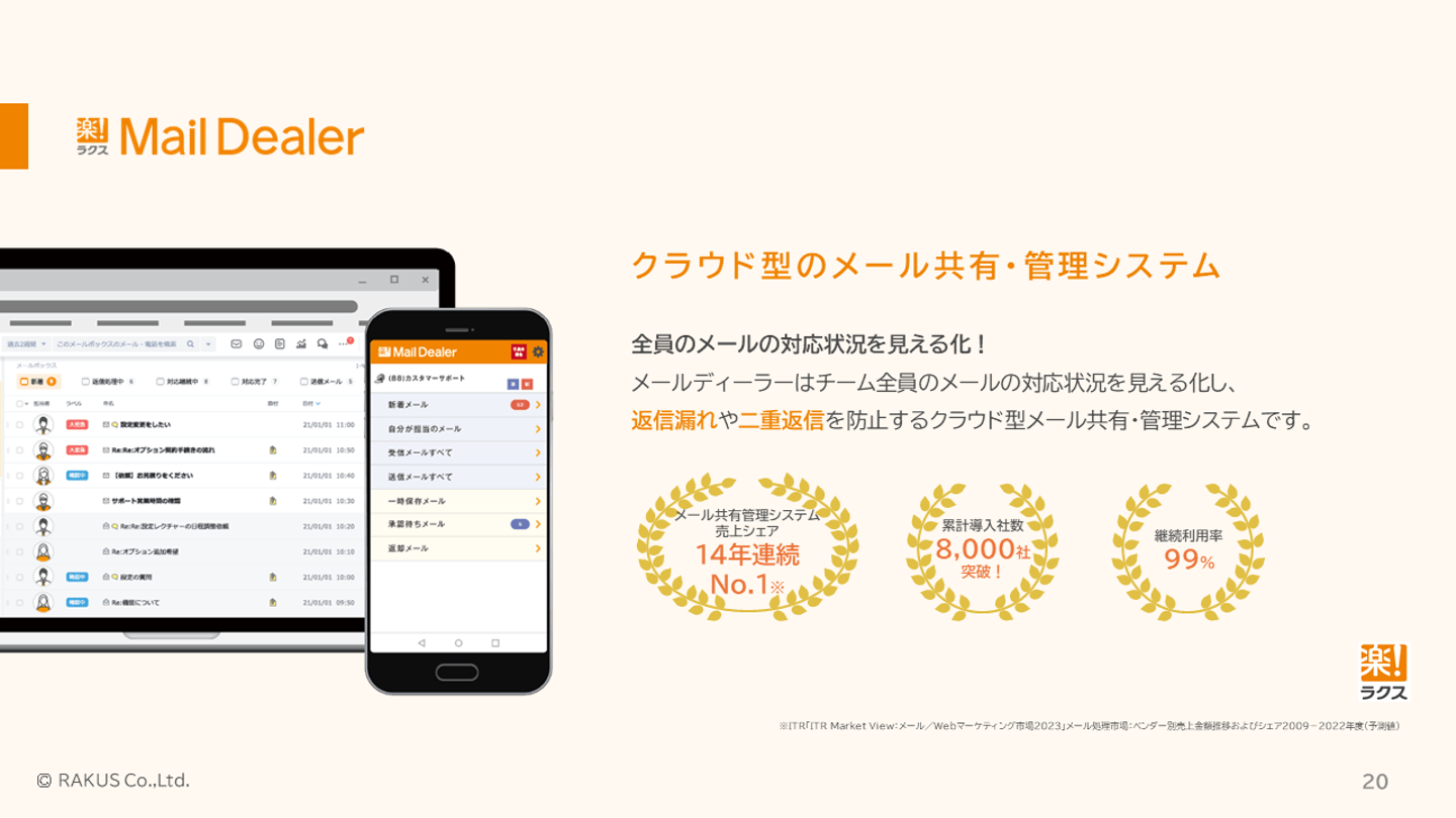 山岸(営業) 「メールディーラー」は、実はラクスで一番歴史のあるサービスで、2001年から提供しています。しっかりとお客様の課題解決をしてきて、14年連続売上シェアNo.1(※)、累計導入社数8000社を超えています。