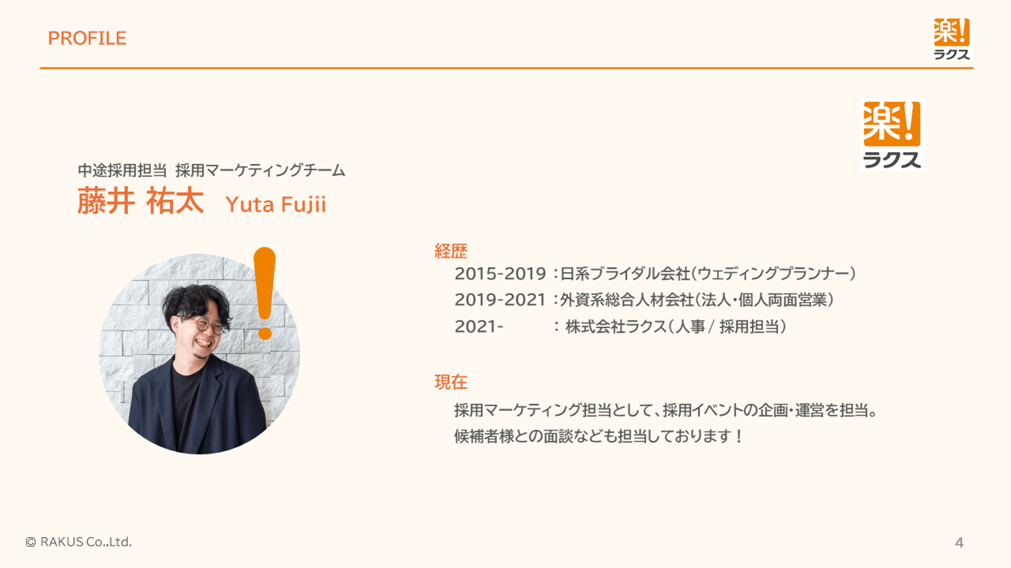 藤井(採用担当) 中途採用担当の藤井です。本日は進行をメインに務めます。経歴は、新卒でウェディングプランナー、人材会社・転職エージェントで法人個人両面型営業をしていました。2021年にラクスに入社し、採用マーケティング担当として、カジュアル面談や説明会の企画運営をメインで行っています。本日はご参加のみなさんと一緒に、現場のみなさんの本音を引き出していきたいと思います!