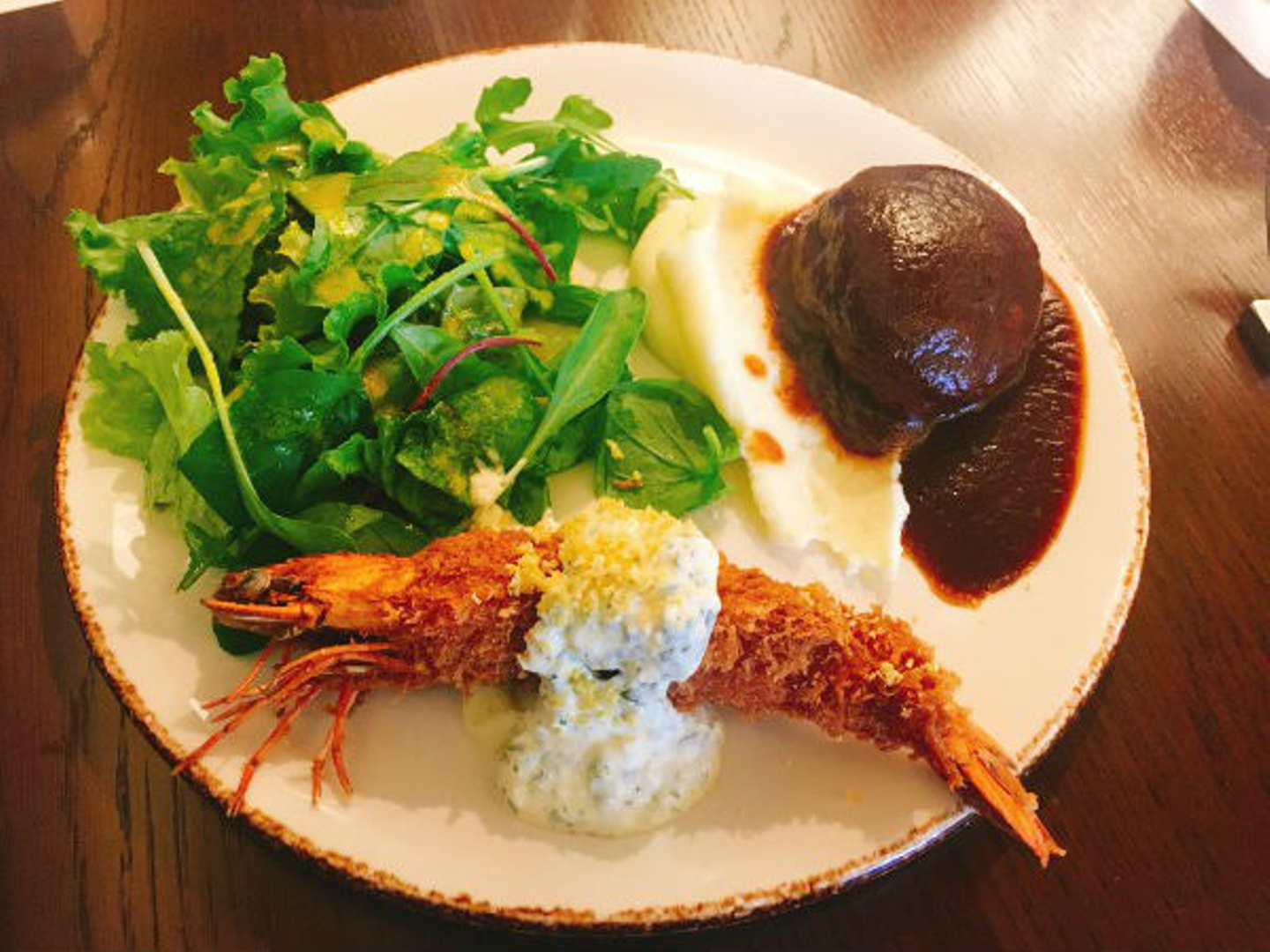 他にもデミグラスハンバーグプレート (平日のみ)税込1,880円も、商品名はハンバーグプレートなのにそれ以上にメイン感のあるでっかいエビフライが印象的。