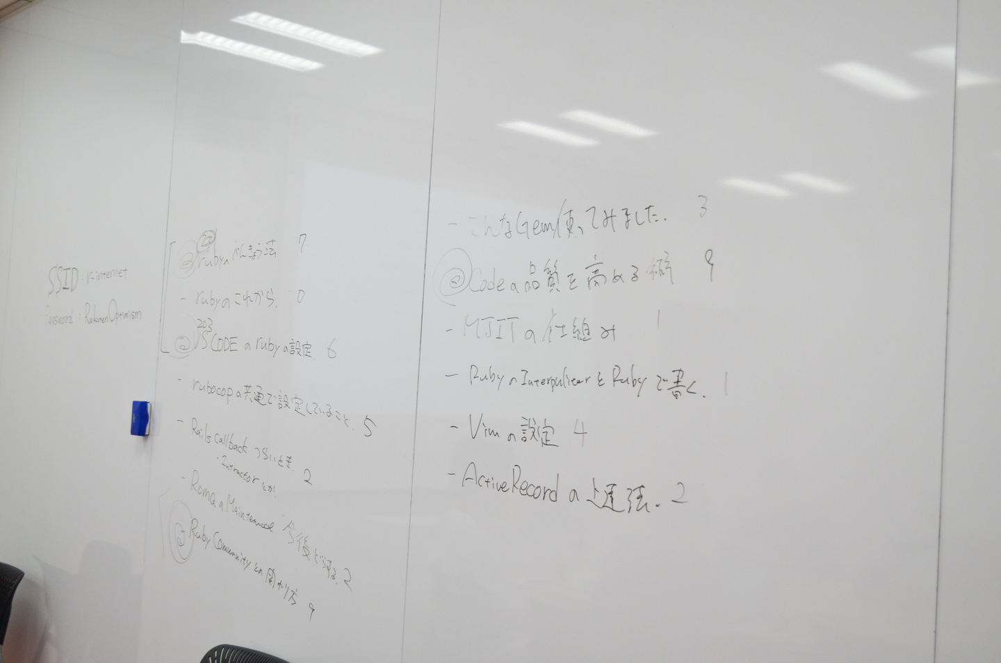 最初にラクマエンジニアの岸さんより、4月に開催されたRubyKaigiの振り返りの発表をした後に、OST形式でみんなでワイワイ話をしました。OST形式とは、当日 参加者から話してみたい話題を募り、テーマごとにグループをつくって話をする形式です。