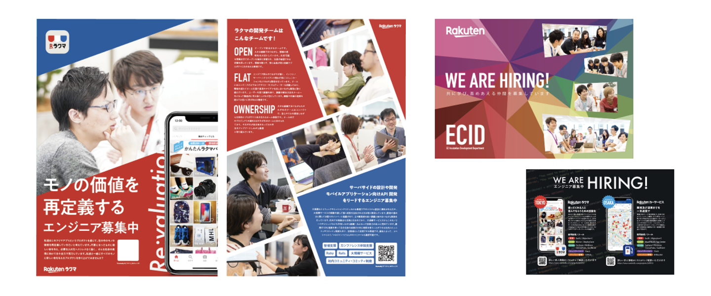ECIDがエンジニアやデザイナー向けのイベントにブース出展する際に、使用するロールアップバナーとリーフレットのクリエイティブ制作をしました。楽天のコーポレートカラーの赤が映えるデザインに、ECIDメンバーが積極果敢に仕事をしている写真をふんだんに使っています。