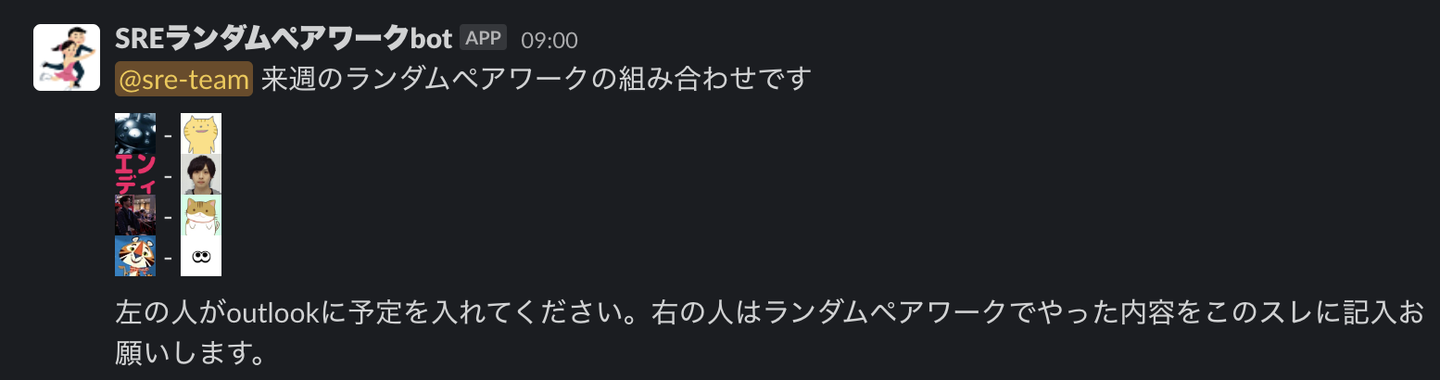 SREチームではSlackのBotが金曜日にペアを決めて通知してくれます。