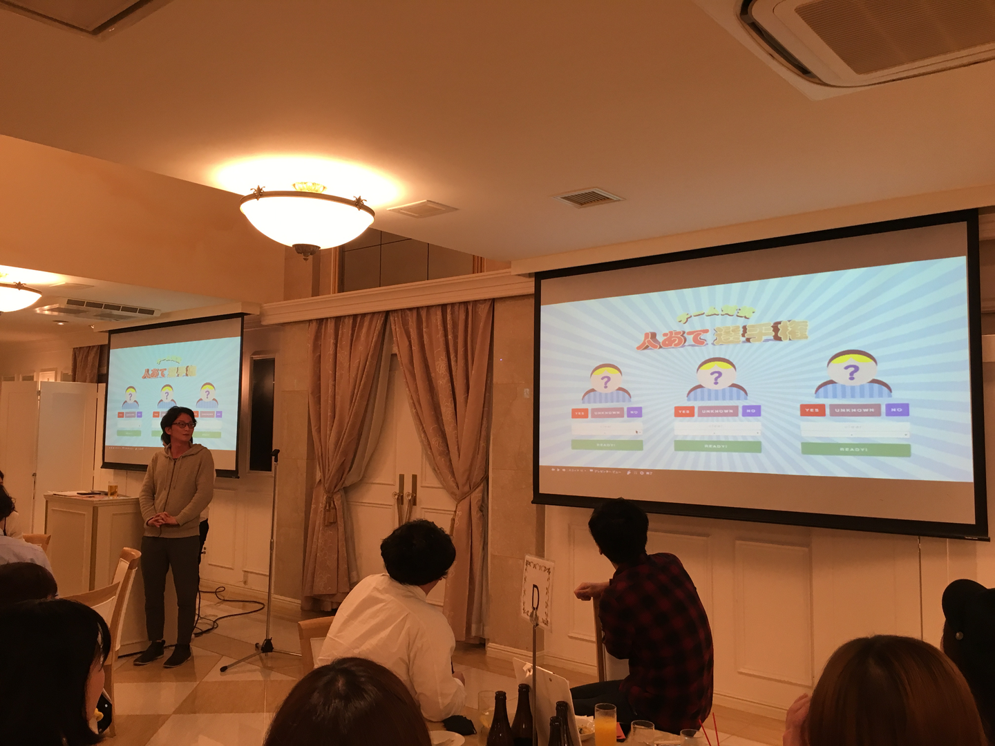 クイズは回答者グループが質問をしながら、出題側が事前に選んだ三人のメンバーを推測する人当クイズで、締め会実行委員メンバーが独自に開発したオリジナルのクイズシステムです! みんなメモをとったりわいわい推測したりとどのグループも大盛り上がり!