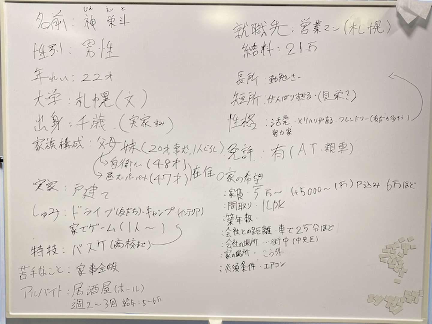 インターンシップとは違いその日中に完成を目指すことになるので、ペルソナの性別・年齢・大学・出身地・家族構成・実家はこちらで設定し、他の設定を考えてもらいました。