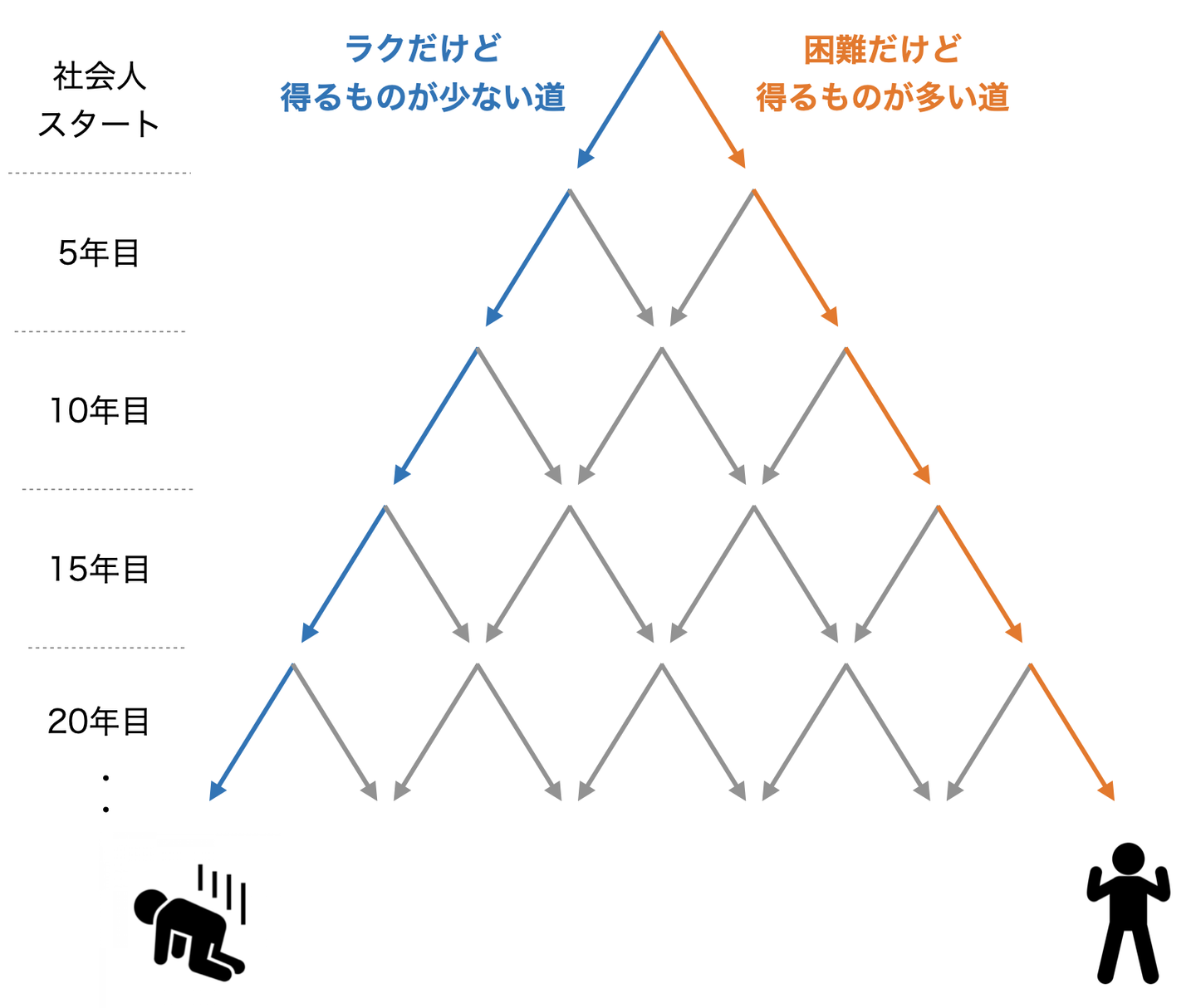 でも、世の中には、それとまったく逆の動きをしている人もたくさんいます。目先のラクやトクを取らず、より困難な道を選ぶ人たちです。この人たちは、単純にストイックというわけではありません。彼らだって、ラクやトクはしたい。ただ、時間軸が違います。今ではなく未来のラクやトクを見ています。