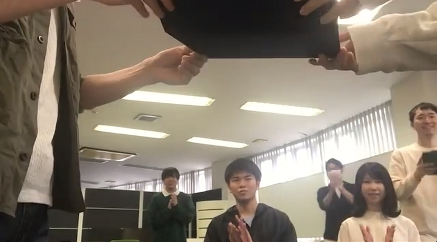 Webカメラの前で授与が行われ、函館オフィス・東京オフィスの社員もZoomを繋いでその様子を見守ります。