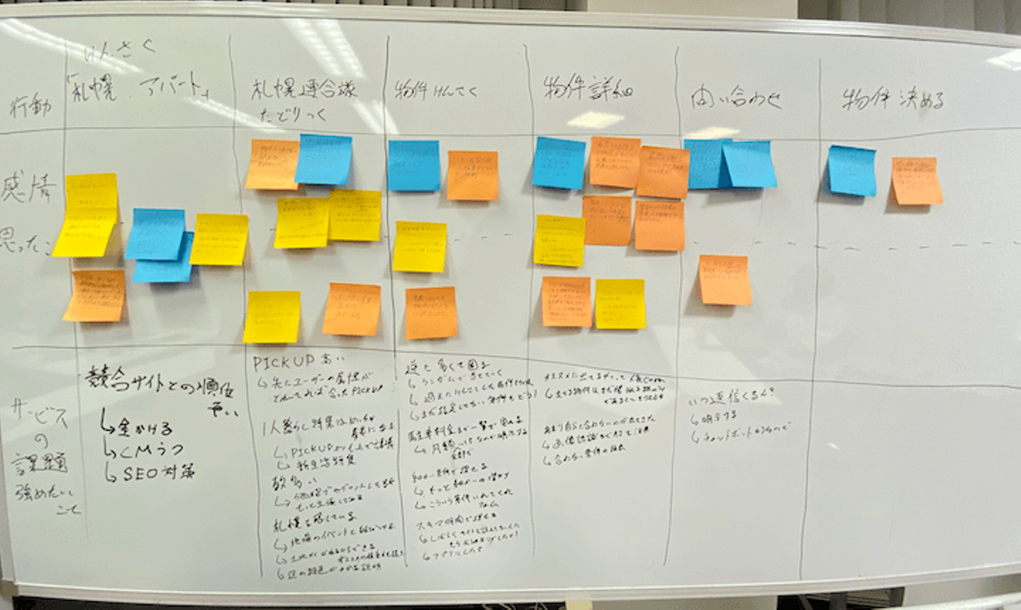 ペルソナの「行動するときの感情・思ったこと」を付箋にどんどん書いてもらい、ホワイトボードで作成した表に貼って可視化していきます。