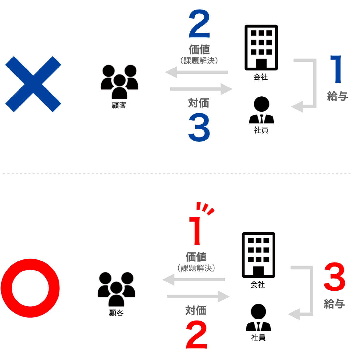 皆さんの給料は、お客様が困っていることを解決し、その価値に満足したお客様がお支払いいただいた対価から出るのです。この流れの順番を絶対に間違ってはいけません。
