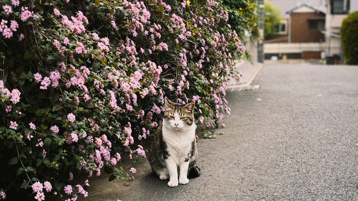 先日お昼を食べた後、オフィスの周りを散歩していたら猫がいました。ちょうど綺麗な花の前に座っていたので思わずパシャリ。