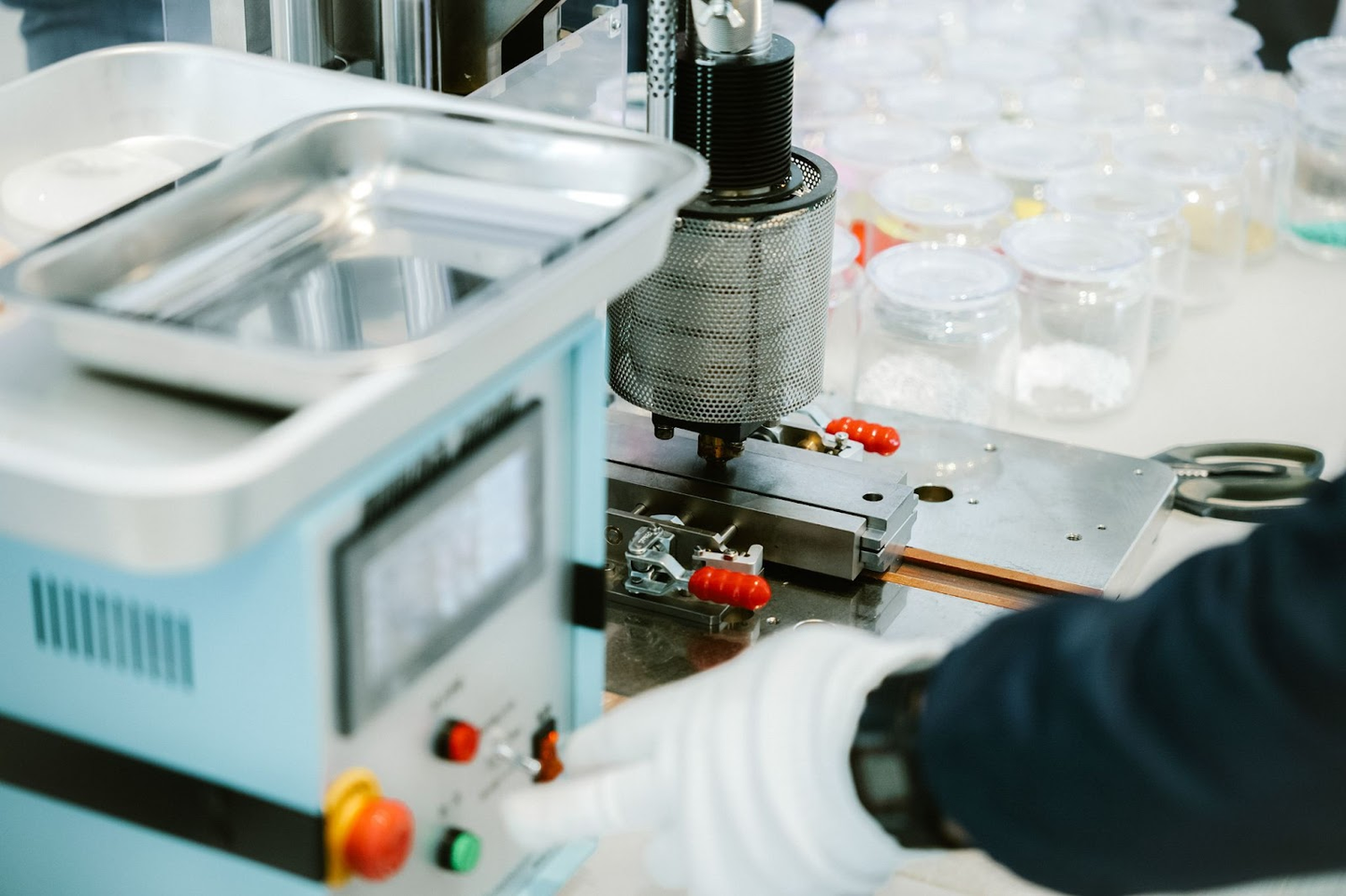 好きな色のプラスチック原料を選んで、機械で溶かし、型に流し込むとプレートが一瞬でできてしまい ます。