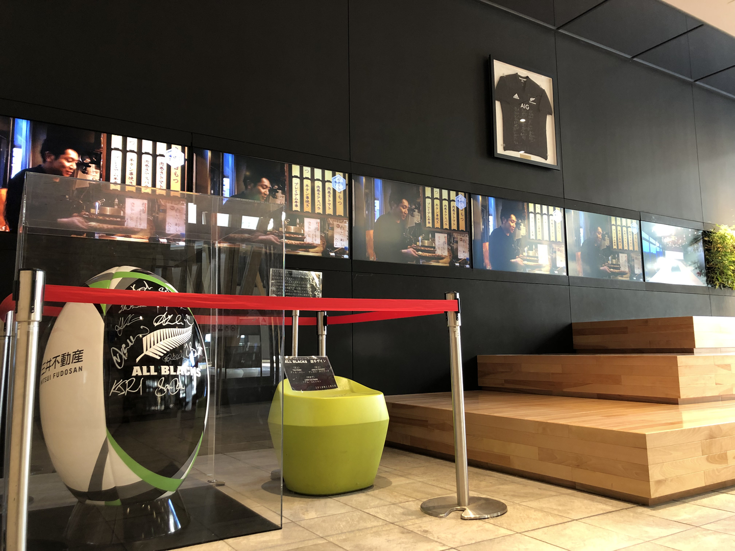 エントランスには、選手たちのサインが描かれた巨大ラグビーボールやユニフォームが飾られています!