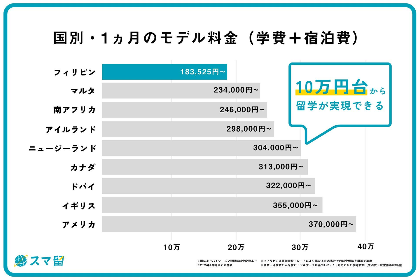 下記は、各国の語学留学における1カ月あたりのモデル費用(学費+滞在費)です。物価高・円安が進む中、「少しでも費用を抑えて、価値ある留学がしたい」という声が急増しています。中でもフィリピンは183,525円~と、他国と比較しても圧倒的なコストパフォーマンスを実現しており、価格面での優位性が支持を集める理由となっています。