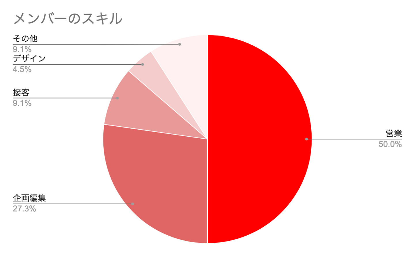 バックグラウンドとしては営業職出身のメンバーが最も多く、半数を占めました。次に多いのが企画編集で、その後に接客。他にも多様な知見を持っているメンバーが活躍中です。