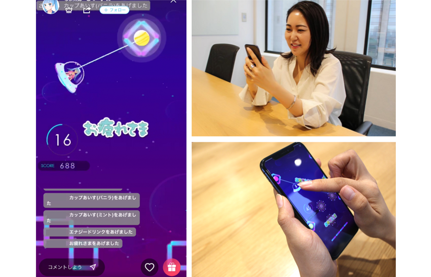 さらに、ゲーム中に視聴者から対象ギフトが送られると、アイテムとしてゲーム内に出現し、それを獲得することでスコアがアップします。
