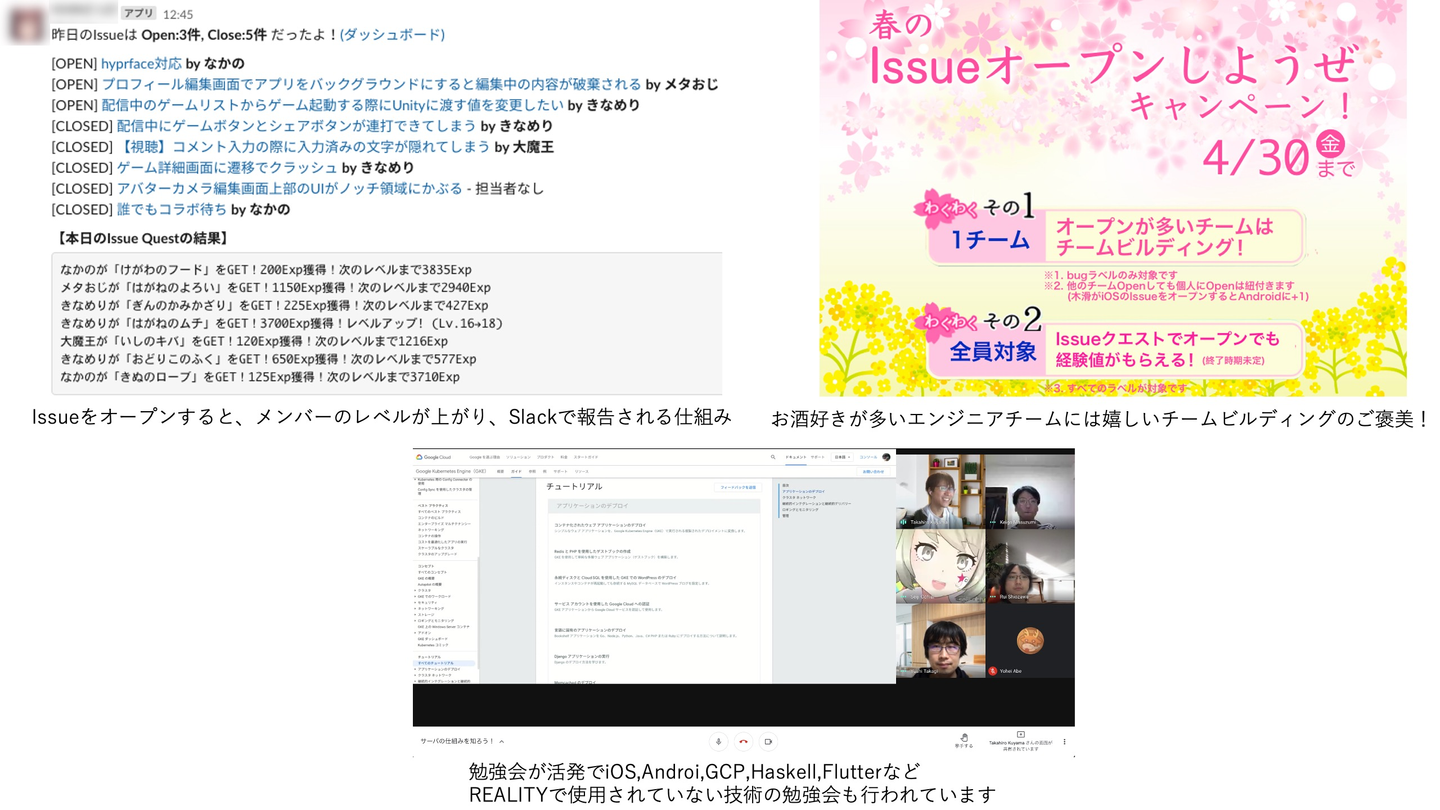 僕自身としては、メンバーのみんなが少しでも楽しく働けるように工夫をしています。例えば、直近のREALITYの目標は「アプリの品質をあげること」なので、そのためにissueをどんどん解決しているのですが、「issueクエスト」と称してissueをクリアするごとにアイテムがもらえて、どんどんレベルアップするという仕組みを作ったり、直近ではバグ発見のキャンペーンを開催していたりします。おわちょもその一つでしたが、グループ全体でモチベーション高く仕事ができることが、自分自身のモチベーションにもつながっていますね。