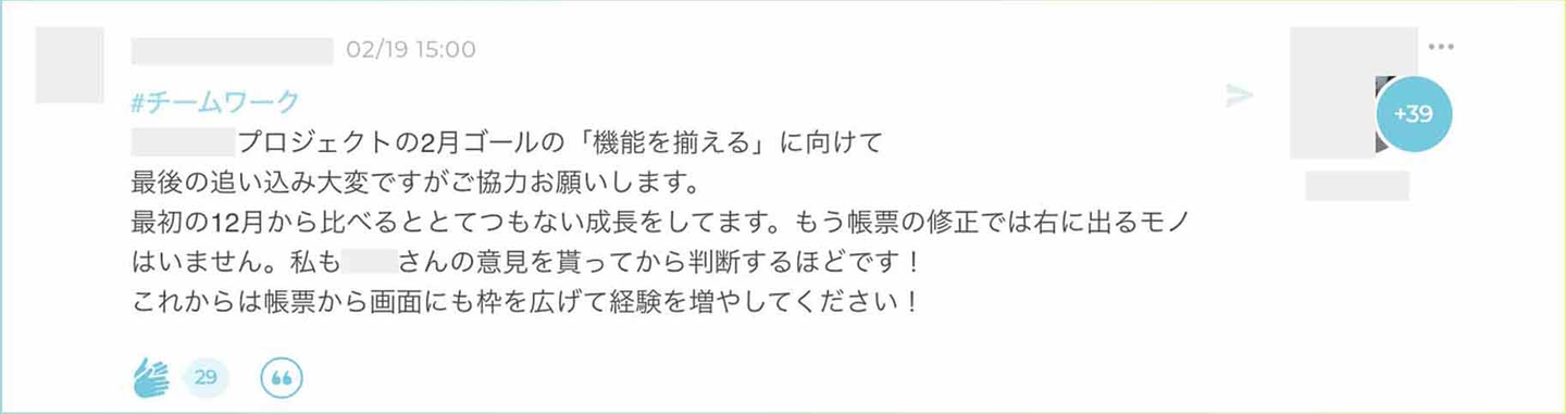マネージャーからこんな形でフィードバックやアドバイスをもらえると、仕事へのモチベーションも増すというもの。こういった投稿が流れてくると、「〇〇さん頑張ってるんだなぁ、私もがんばろ」と見ている方もやる気が湧いてきます!