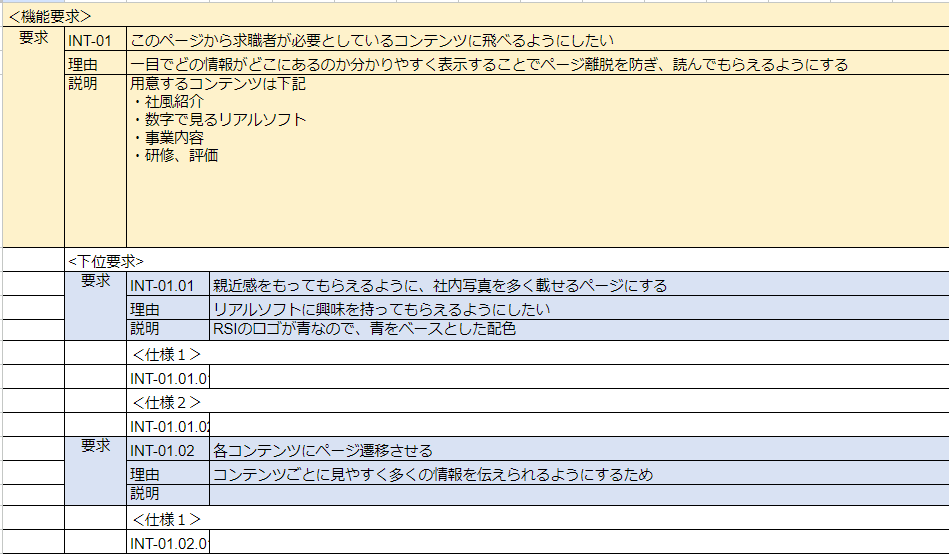 採用HPの現状の課題、何を実現したいのか、各ページの要求等がまとまった要求仕様書を参加者に展開します。