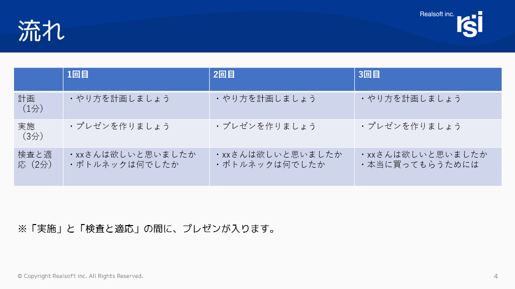 それに対して計画・実施・検査と適応というサイクルを回しながら複数回プレゼンを行うというワークです。