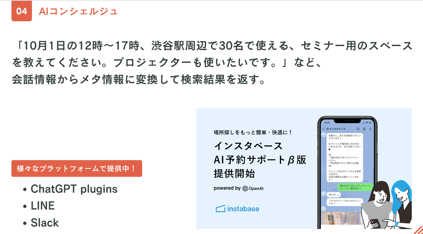 株式会社Rebaseが手がけるレンタルスペースのマッチングプラットフォーム「instabase」では、先日、生成AI(ChatGPT)を活用した新機能の提供を開始しました。