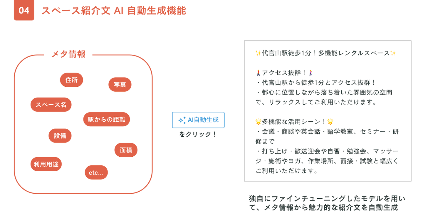 スペース紹介文AI自動生成機能は、スペース掲載者向けで、従来は掲載者自らが考えていたスペースの紹介文に関して、メタ情報から自然言語を自動生成する機能です。
