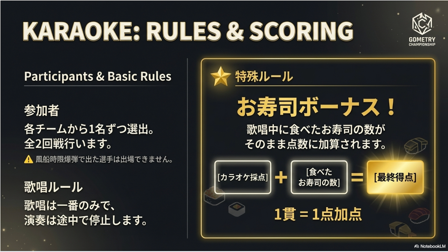 「カラオケの採点 + 歌唱中に食べたお寿司の数(1貫=1点)」がスコアになるという謎ルール(笑)