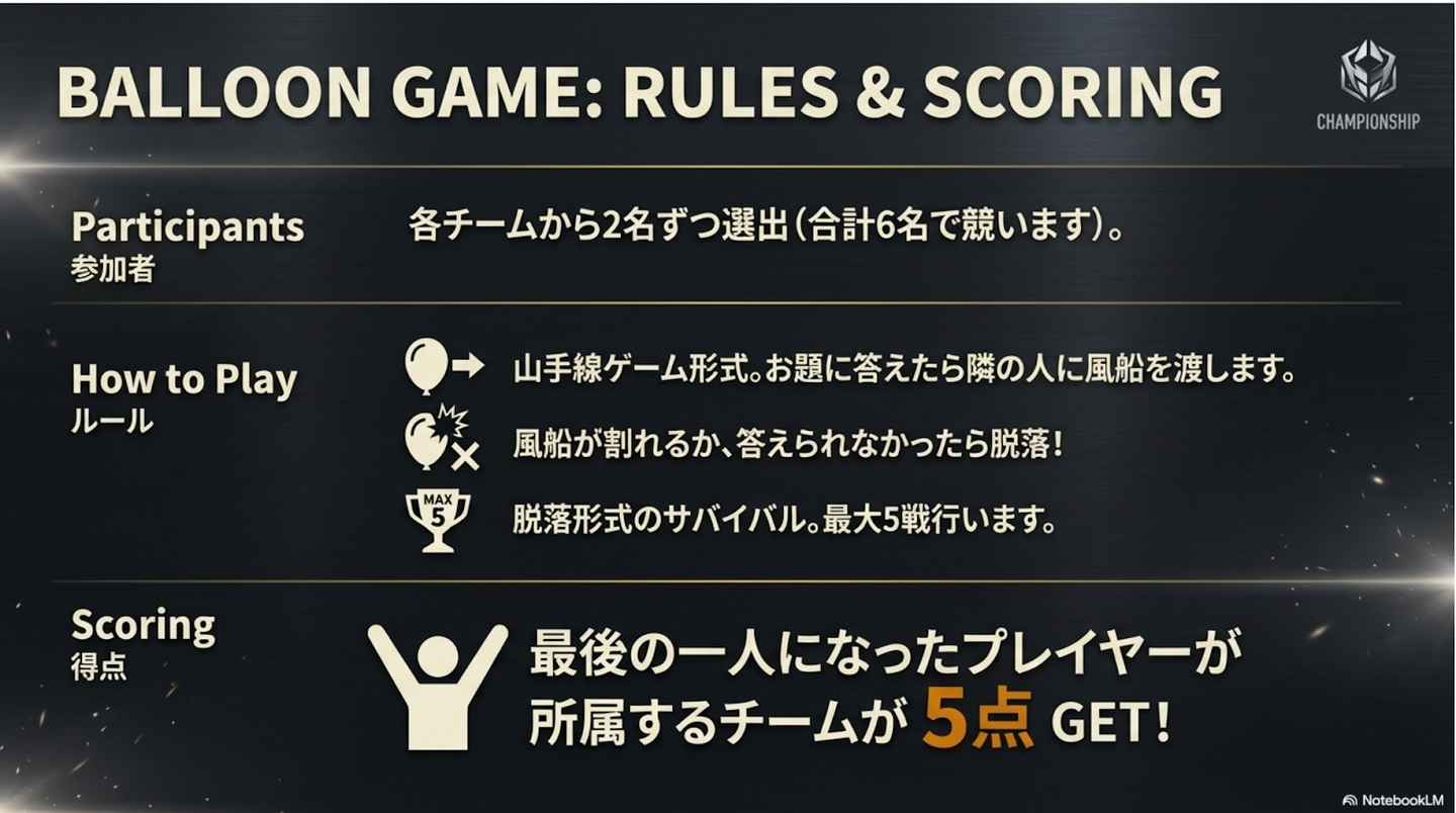 当初は「風船時限爆弾」を予定していましたが、「風船が割れる音が怖い!」という女性陣の声もあり、急遽ルールを変更。