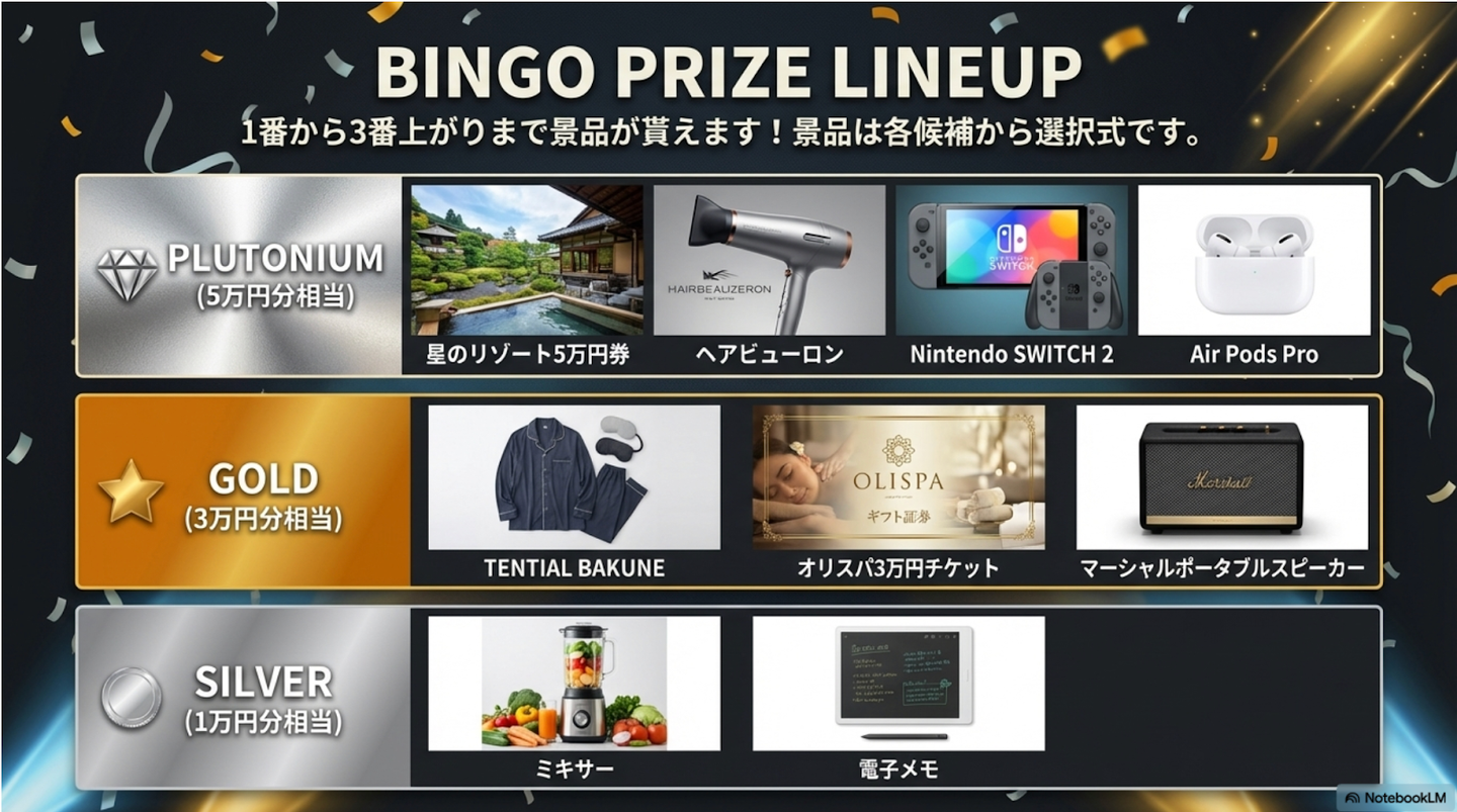 1番から3番に上がった人には、ランクごとに豪華景品の候補から好きなものを選べるという仕組み!