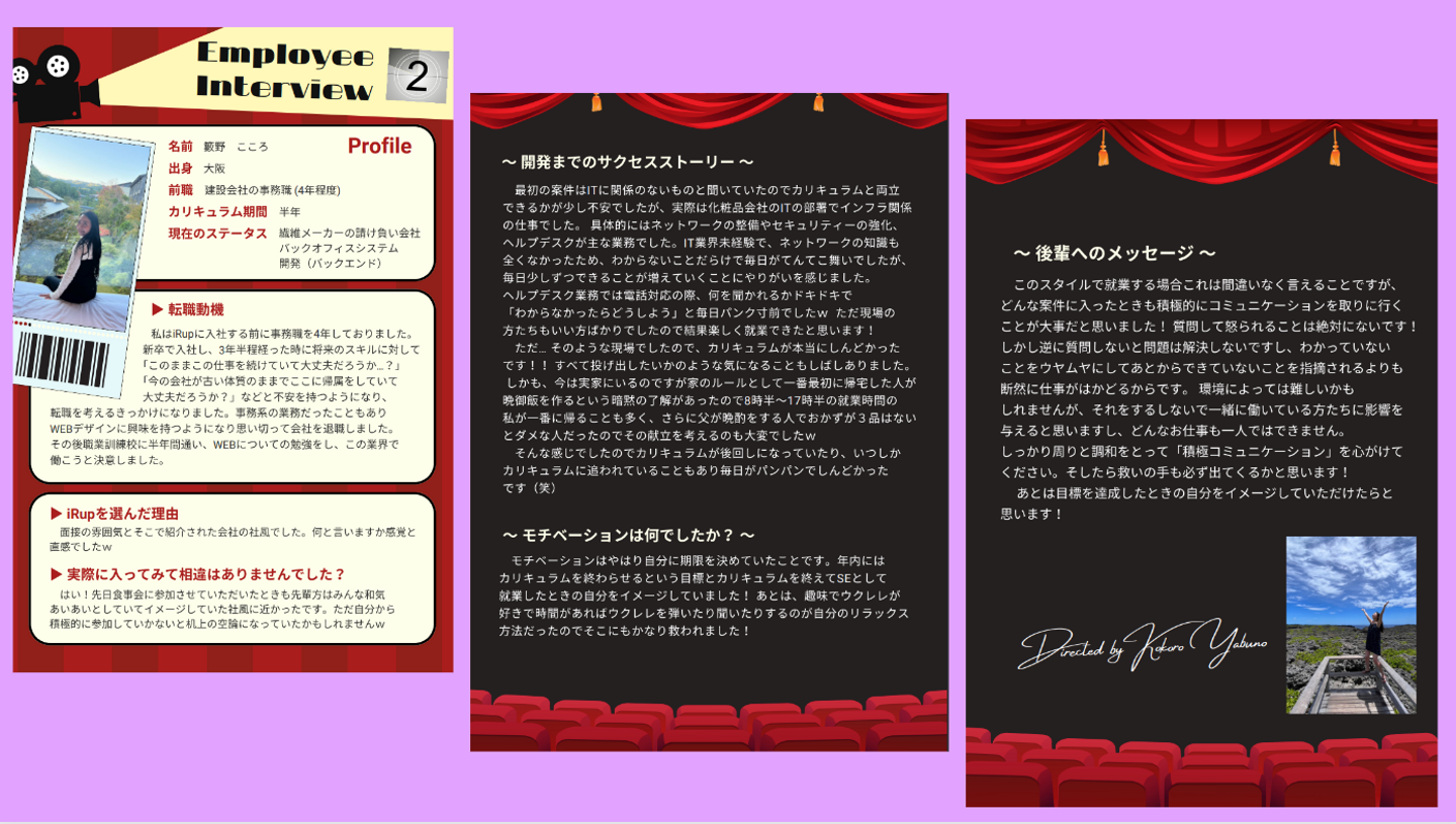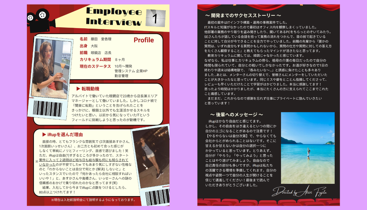 ”革新的な技術と情熱で、人・企業・社会へイノベーションを起こす” 私たちiRupは、技術を用いてお客様や社員が共に成長し続ける会社を目指しています。 社員一人一人の力を最大限に引き出し、社会への価値提供をし続けることを約束します。 <事業内容~4つの柱~> ・テックソリューション(システムエンジニアリングサービス) 企業様のビジネス成長をシステム面からサポートする為、技術と人材を最大限活用し、お客様の期待を超える価値創造の実現に向けて取り組みを行っています。 ・教育事業 未経験~熟練まで、幅広い層に対応した研修プログラムを展開し、企業様の人材・能力開発をサポート。 iRupの社内教育スキームを基にしており、受講者が現場で即戦力として活躍できるように最新の技術トレンドに対応した実践的なプログラムを提供しています。 ・受託開発 要件定義~保守まで品質とスケジュールに厳格にこだわり、効率的かつコストパフォーマンスの高いソリューションを実現。 クライアントの具体的なニーズや要件に合わせてカスタマイズしたソリューション提供力が求められるため、専門的な技術や知識を活かした仕事が経験可能。 ・HR事業 転職が当たり前の時代だからこそIT人材だけでなくあなたのポテンシャルに合わせた職業の紹介をしていきます。 ーーーーー実績ーーーーー ・2021年1月 iRup 創業 ・2023年4月 22年度売上1.5億 ・2024年4月 23年度売上5億、前年度比300%UP ・教育コンテンツの受託開発