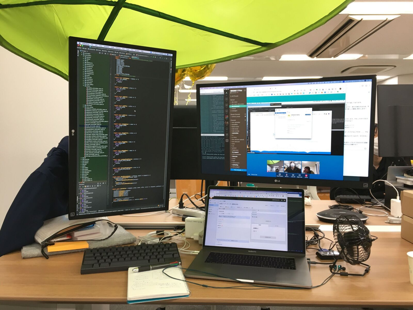 日除け、ディスプレイとてんこ盛りの作業環境です。作業効率が上がるのであれば、これほど手っ取り早い施策はないかもしれません。