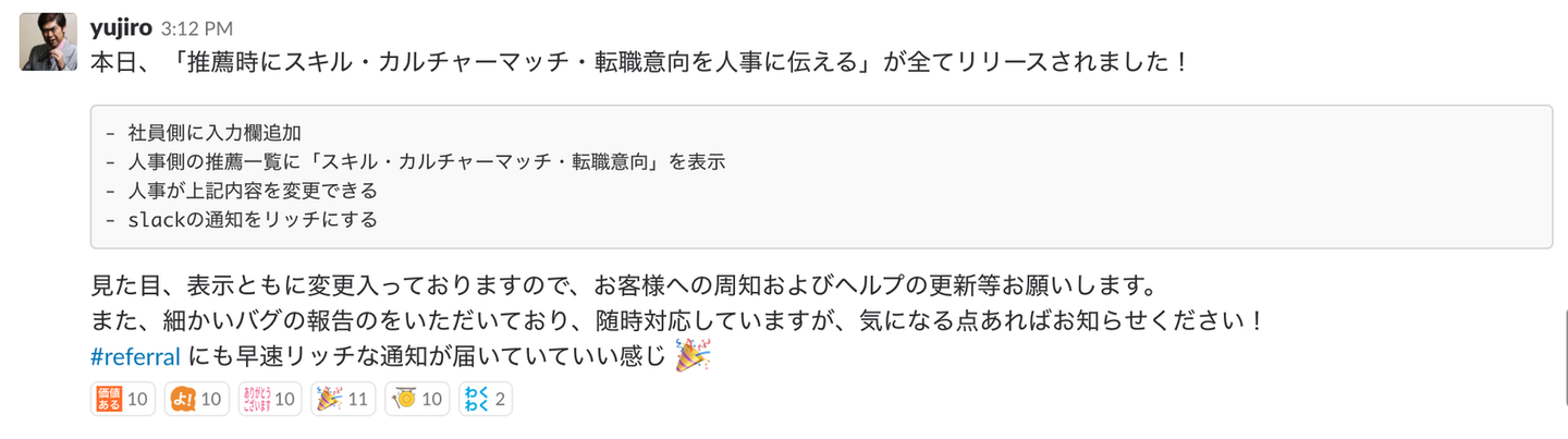 こうして追加された要望が開発ロードマップに乗りリリースされたケースもあります!なので、リリース報告すると社内Slackでの反応がとても良いです