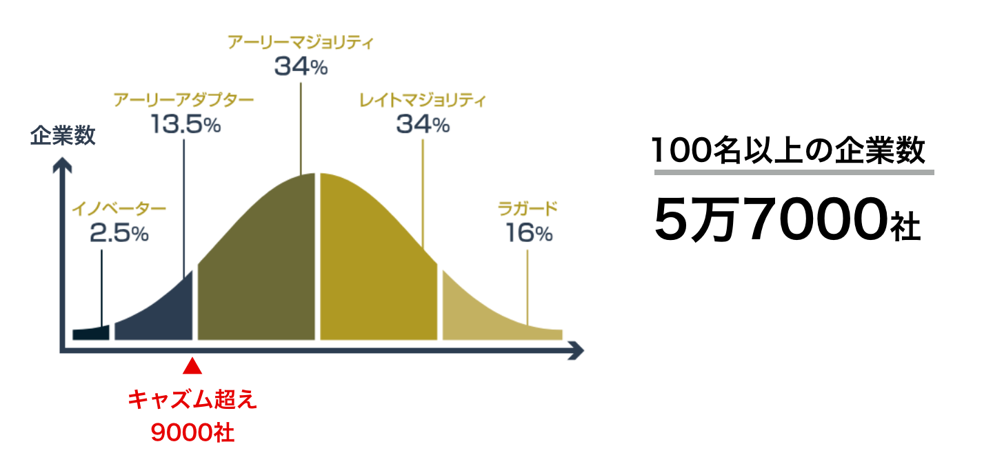 日本には、僕たちがターゲットにしている会社は5.7万社います。イノベーション理論によるキャズム超えは、16%です。つまり、9000社です。