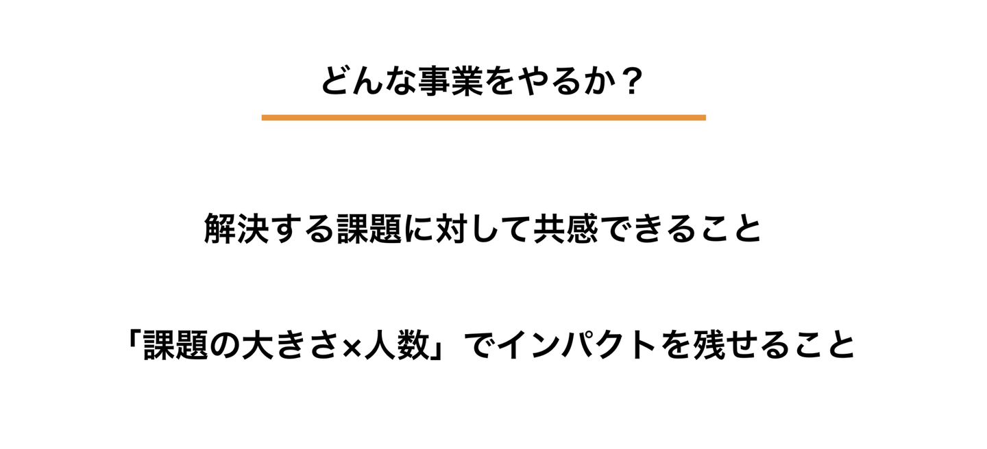 起業を志したとき、実は、どんな事業をやるのか決めていませんでした。しかし、どうせやるならば「自分がとても共感できる課題解決をしたいということ。より多くの人との、大きな課題を解決できることをしたいということ。この2つの視点で事業を考えました。