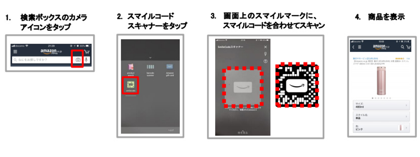 amazonアプリの検索窓右側にあるカメラマークからsmilecodoリーダーを選択してコードを読み込むと、商品ページに直接アクセスできます。