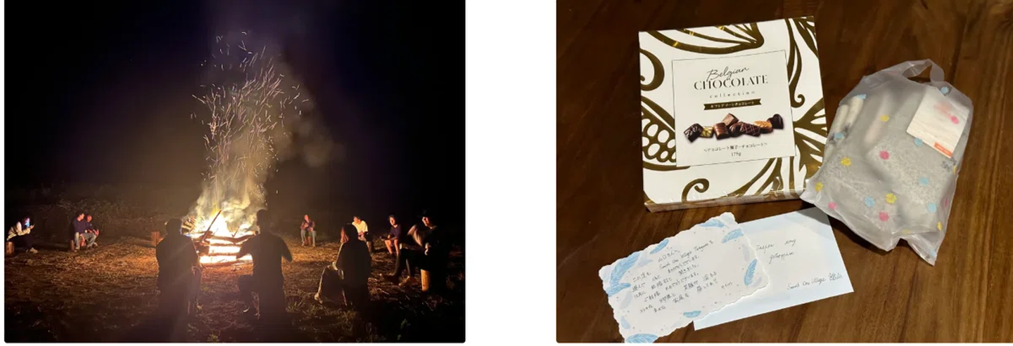 写真は、会社のキャンプ部で、当時私が担当していたお客様先に宿泊させていただいたときのものです。夜はモンゴル式のキャンプファイヤーを囲み楽しいひと時を過ごしました。帰宅時には、個人宛でお手紙やプレゼントをいただき、ご担当者様の温かさを肌で感じました。