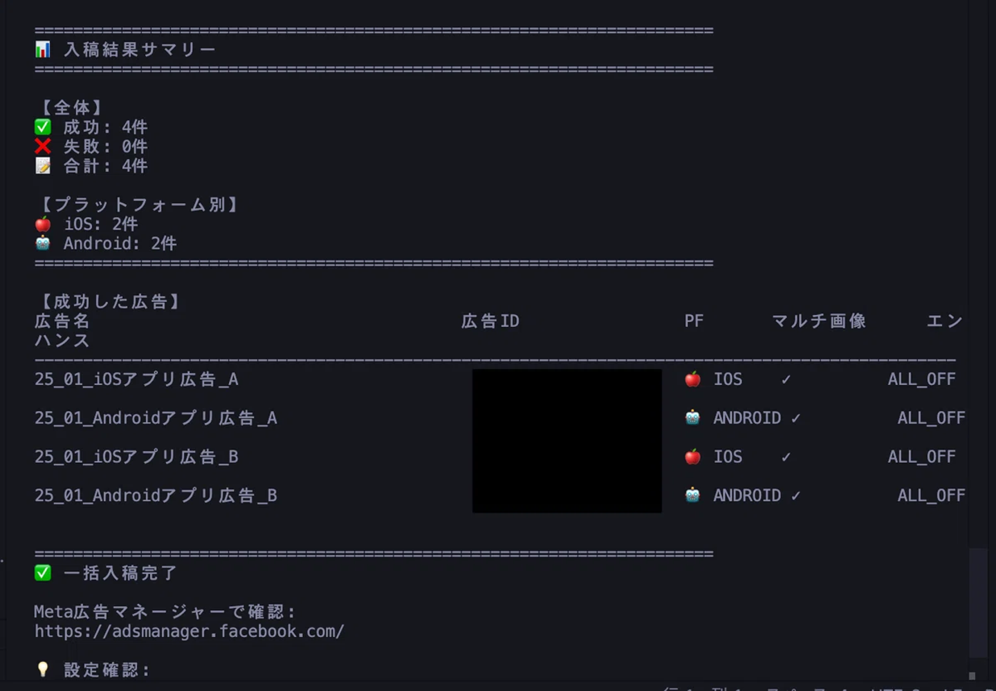 私もAIを使い、広告の入稿自動化や、バナーの一括作成、分析ツールの作成などを実装し、作業工数の大幅削減をこの3ヶ月で実施することができました。