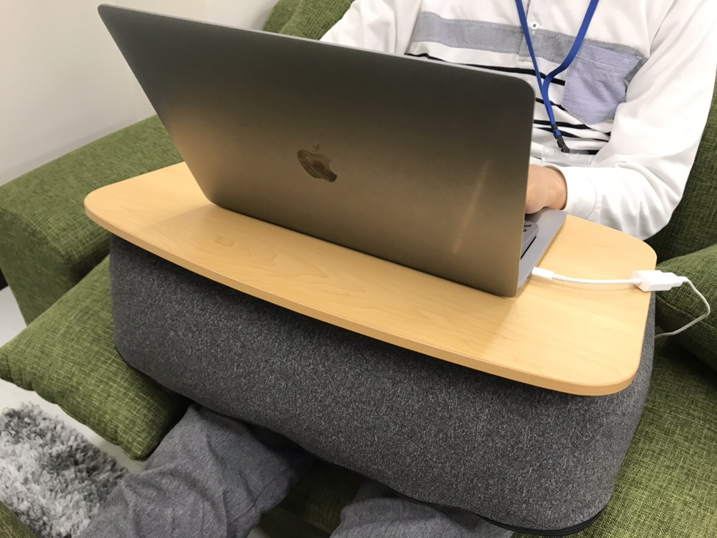 写真で膝の上にクッションを置いて作業しているのですが実はこれ、このスペースで作業する為だけにエンジニアが私物を持ち込んだというこだわりの逸品。