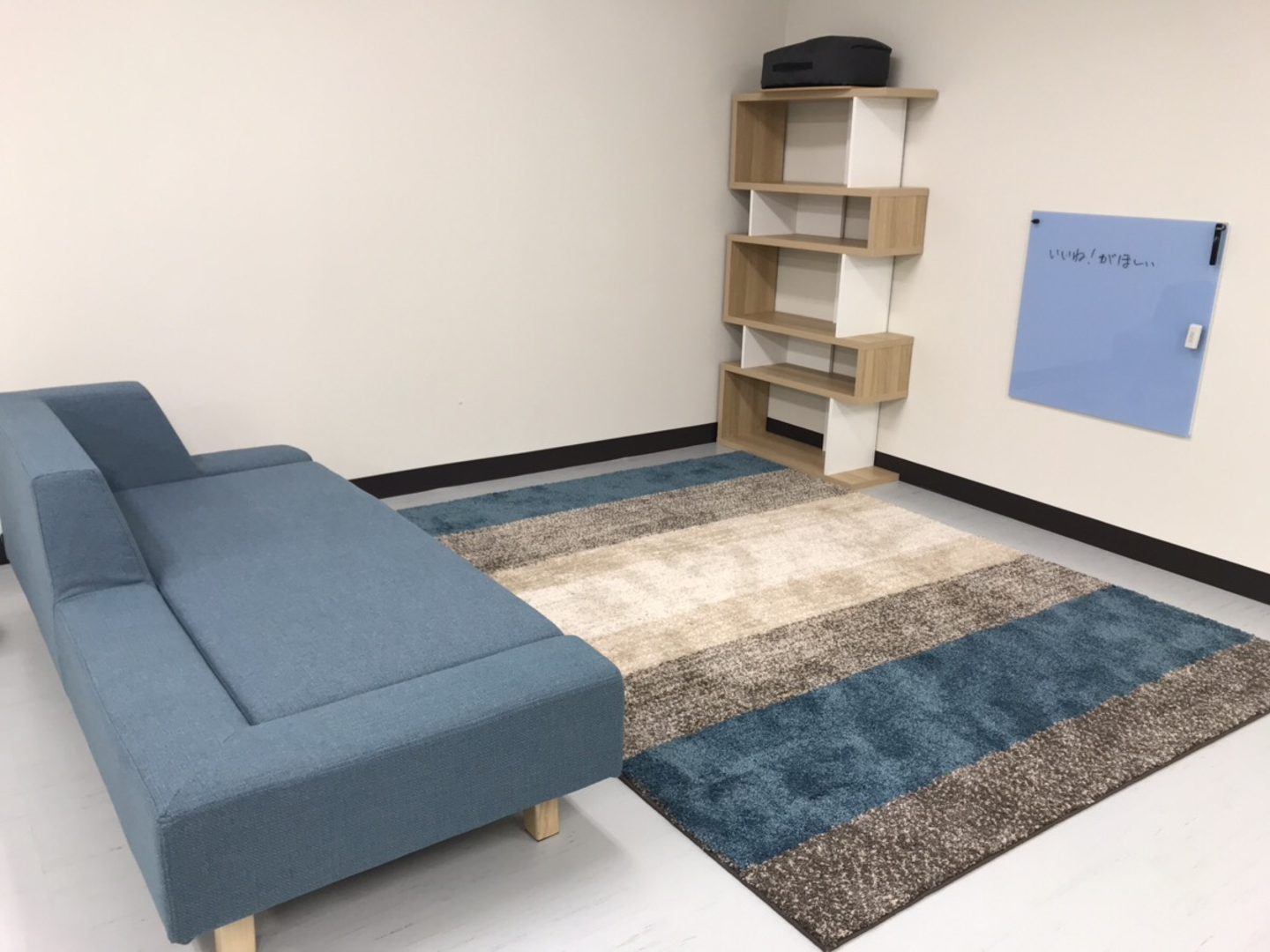 ん?家のような素敵なスペースがありますね。逆サイドにもソファとラグがひいてあるこの空間は、『芝生エリア』と『オフィスエリア(執務スペース)』の間にある『コアスペース』を改装したものです!